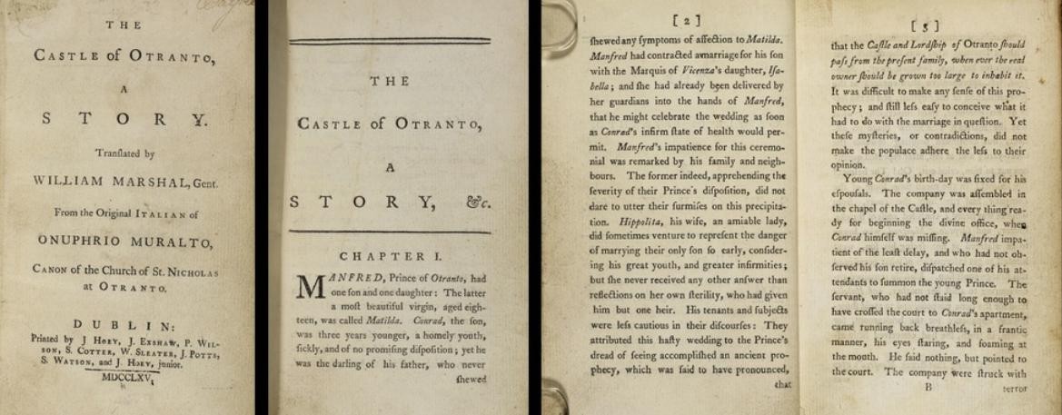 就这样,在文艺复兴之后哥特式的建筑就逐渐退出了主流。但是到了18世纪,哥特文化从新开始在英国兴起,不仅仅体现在哥特式建筑的复兴,同时也出现在了文学作品和绘画作品之中。第一部哥特小说是由英国作家霍勒斯·瓦尔普所创作的《奥特朗托城堡》,在小说中描绘了大量的鬼怪和灵异故事一下子吸引了大批的英国普通民众争相阅读。随之开始诞生大量的同类型的小说,而这些小说当中非常显著的特征都是各种灵异事件发生在哥特式的建筑中。有趣的是,市面上出现的大量哥特式小说竟然间接地提高了当时英国普通群众的识字水平。