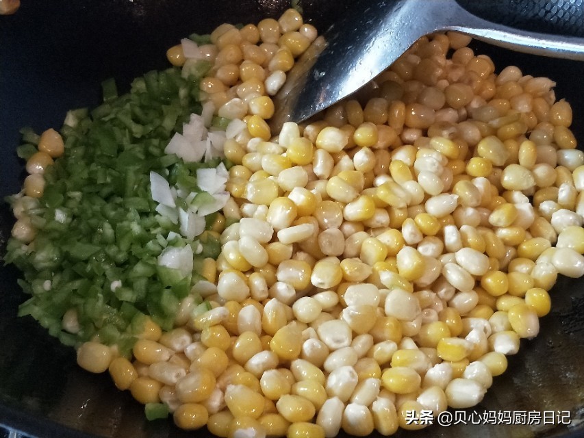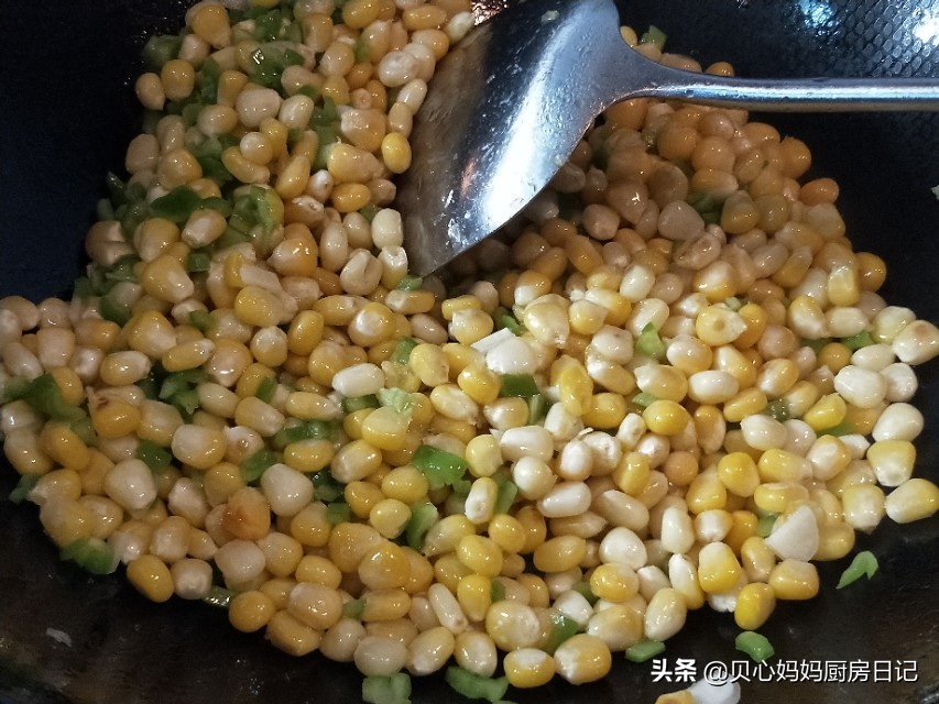 2、我加入的是青椒,若你想颜色更诱人,也可以加入少量胡萝卜或大红辣椒,这样颜色更丰富一些,只是千万别加多,不然吃起来就不是玉米粒,会少了那种粒粒爆浆的感觉了。