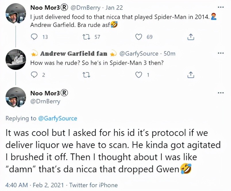 其实,关于加菲是否参演《蜘蛛侠:英雄无归》,一年前就已经知道了。加菲证实了一年前的“外卖”事件,当时有推主称自己给加菲送了外卖,而且直接送到了蜘蛛侠的拍摄场地亚特兰大,推主还称他点了酒,后来他澄清只是点了玉米卷。现在想来,加菲也太不小心了,一不小心就会让保密工作白费。