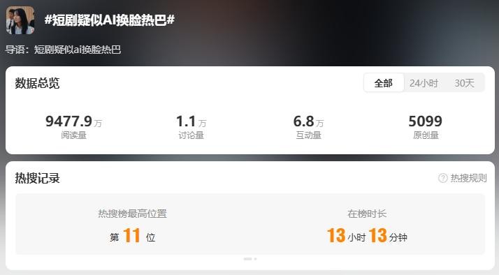4月10日,有网友质疑一部网络短剧疑似把演员AI换脸成知名女演员迪丽热巴,剧中还多次出现她的镜头。相关话题登上热搜。