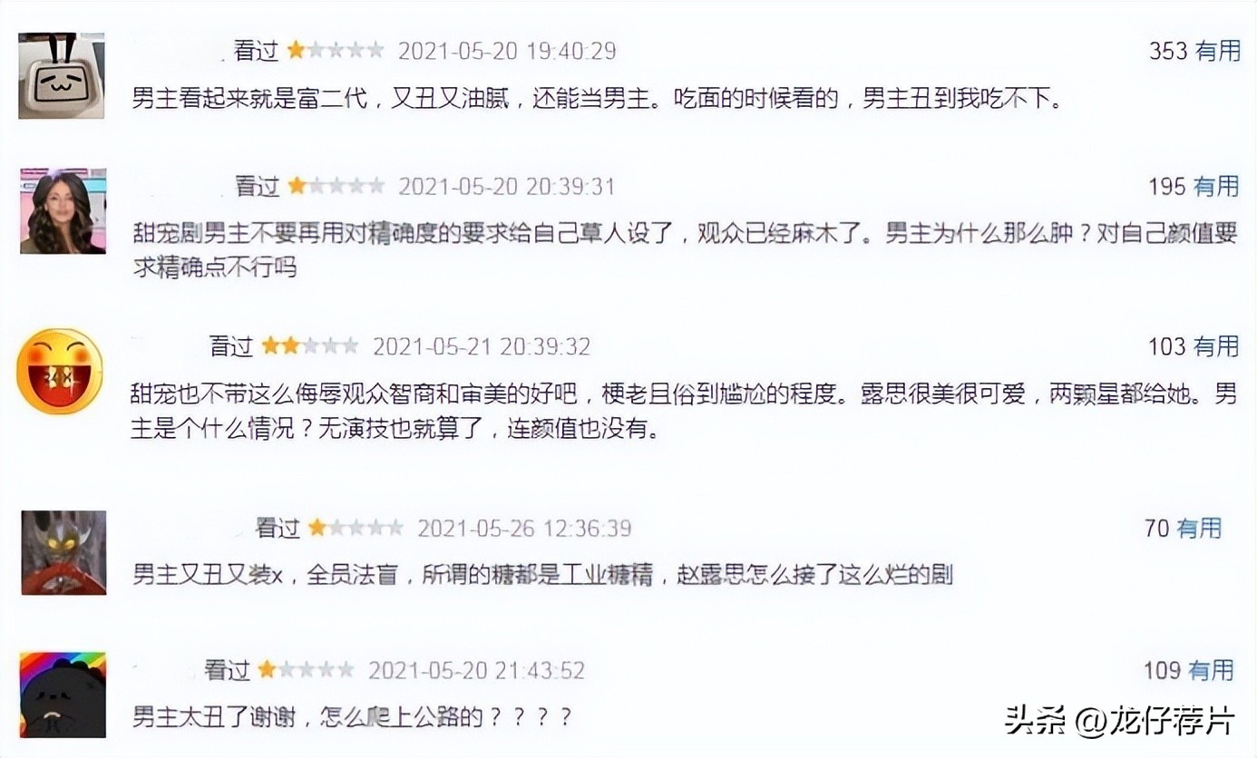 除了剧本的幼稚,男主灾难级的表现更是让人无语凝噎。刘特全程面瘫还油腻,尤其是刻意模仿韩剧中霸道总裁的台词,我吃饭的时候,差点直接吐出来。从观众的评价也可以看出,男主的演技有多么让人无语,火不起来不是没有原因。