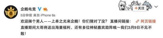 企鹅电竞在微博中同样的表达了对Gogoing加入企鹅电竞的欢迎,也有一部分的网友在评论下说到自己猜到了Gogoing要加入企鹅电竞,因为大哥经常参加腾讯举办的一些活动。还有不少人调侃道战旗是真的不行了么。