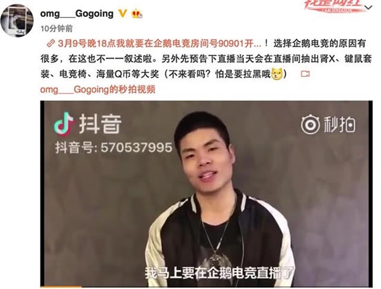 Gogoing很早之前就传出要签约新直播平台,今天Gogoing在微博中公布了自己将会在3月9日晚上18点在企鹅电竞房间:90901开播、开始新的征程,大哥在微博中只是简简单单的说选择企鹅电竞原因有很多,但是并没有透漏选择企鹅电竞的具体原因。