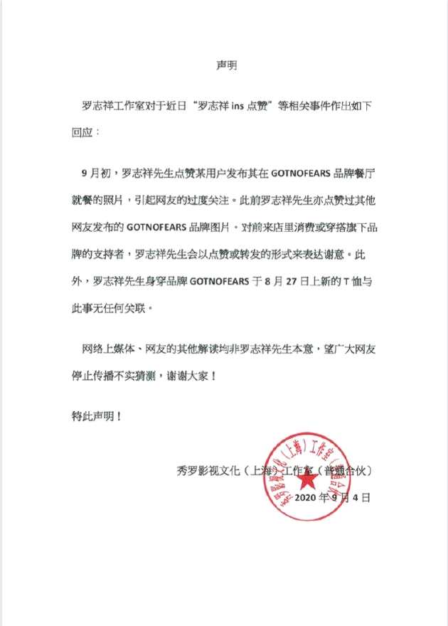 9月4日报道 9月4日晚,罗志祥工作室发声明回应罗志祥ins点赞网红一事,称点赞是对罗志祥品牌的消费者及支持者表达谢意,还表示穿用拼音写着“关你屁事”的衣服与此事无关,网络上的解读并非罗志祥本意。