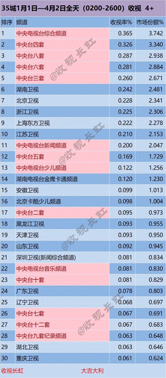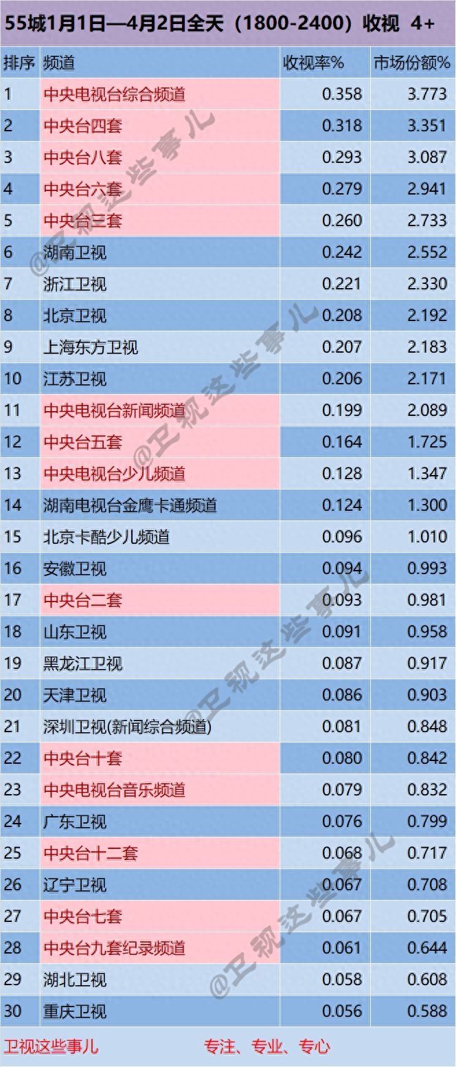 不管55城还是35城,收视率前30均为省级卫视前五的频道。第六名开外的卫视,一年很难播出多少首轮大剧了,也就失去了竞争排行榜单的权利,差距进一步加大。