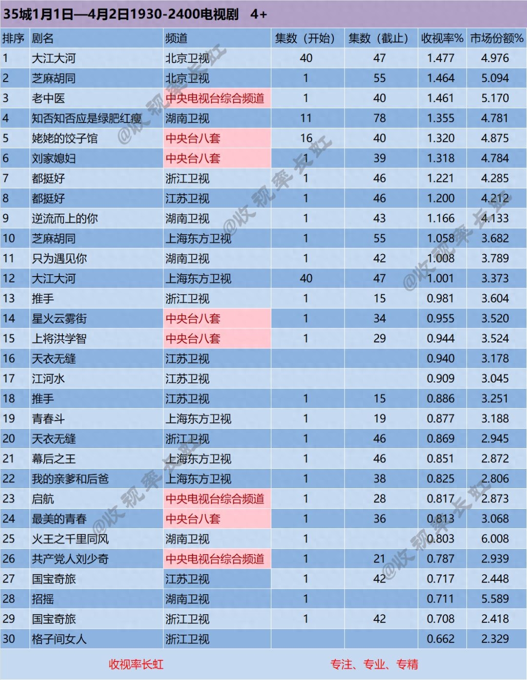 当然,让我心心念念的就是电视圈了,先来看csm55城2019年截至4.2电视剧收视情况。