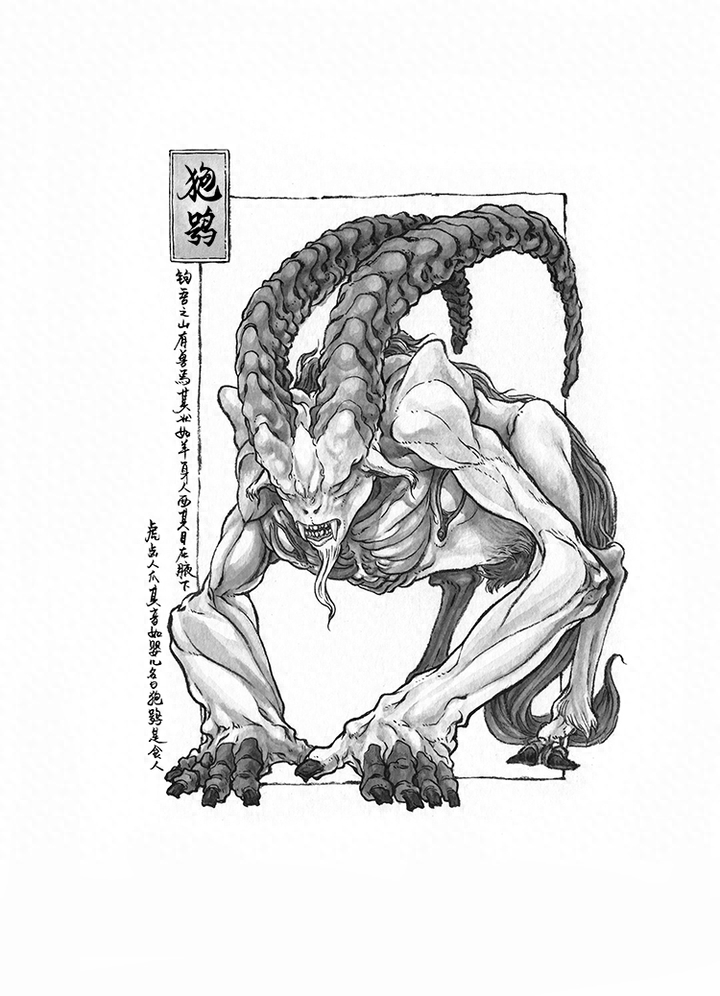 《山海经·北山经》——又北三百五十里,曰钩吾之山,其上多玉,其下多铜。有兽焉,其状如羊身人面,其目在腋下,虎齿人爪,其音如婴儿,名曰狍鸮,是食人。
