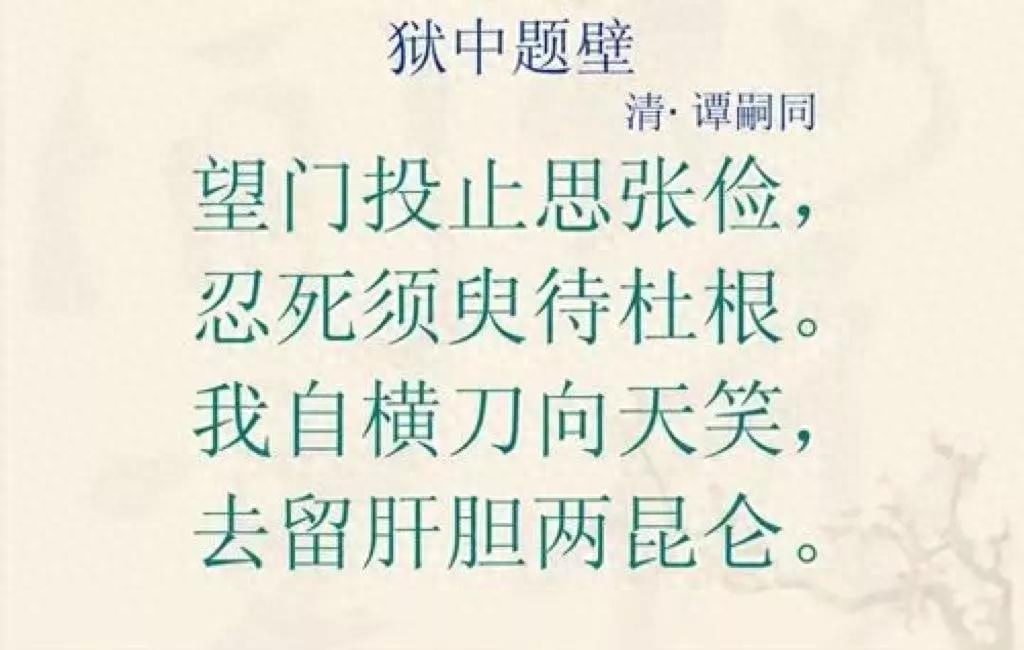 《狱中题壁》是谭嗣同题写在狱中的墙壁上的绝命诗,惊天地泣鬼神。