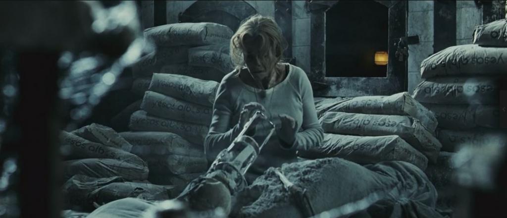 绝望、自责的劳拉抱着西蒙的尸体坐在孤儿院的窗前,摘下丈夫 " 借 " 给她的护身符,服药自尽。