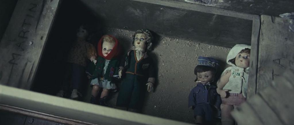 随着一扇窗户突然坠落,玻璃砸破了窗户旁的木箱,第一个线索出现了:箱子里有 5 个娃娃(劳拉的 5 个小伙伴,特征明显:瘸腿、瞎眼、牙箍等等)。