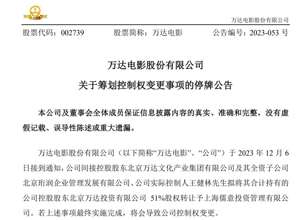 12 月 6 日,万达电影发布公告称,公司实控人王健林及相关公司,拟将其合计持有的公司控股股东万达投资 51% 的股权转让给上海儒意投资管理有限公司。