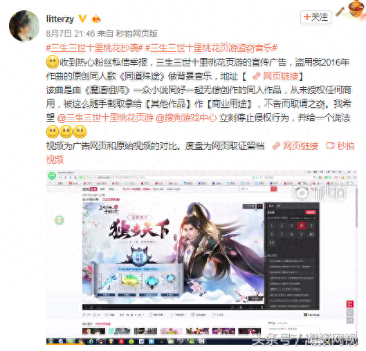 同日,音乐制作人litterzy也斥责《三生三世十里桃花》页游宣传广告私信盗用作品;