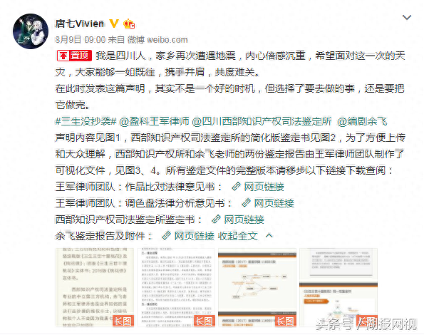 8月9日,正逢四川再遭地震之际,唐七发出声明,贴出鉴定结果,为自己发言:三生没抄袭。