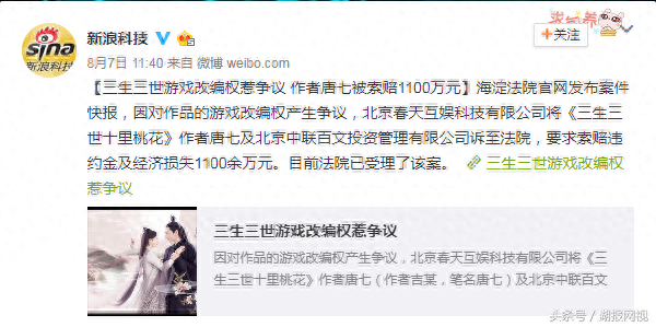 8月7日,一则新闻又将唐七与她的作品《三生三世十里桃花》推至风口浪尖。因三生三世游戏改编权惹起争议,唐七被索赔1100万元。