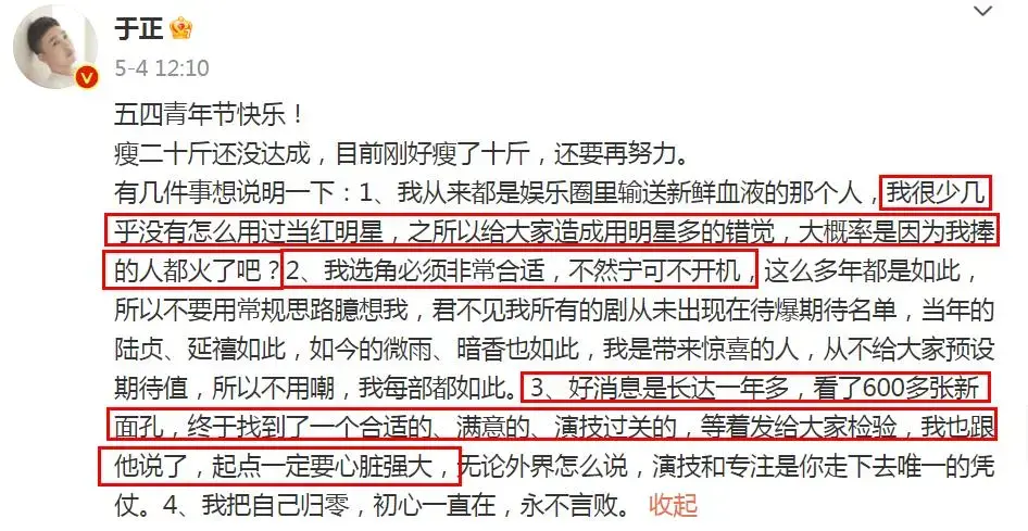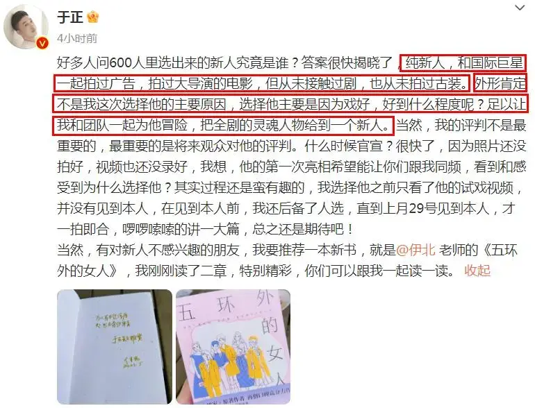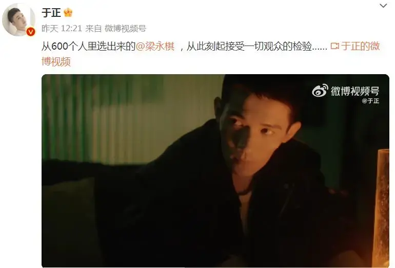 此前,于正还在微博上爆料,表示自己从600个试镜者里挑选出了一位新人,外形在线,演技也很好,自己对他很有信心,很期待大家的反应。