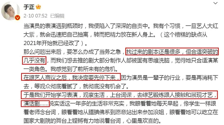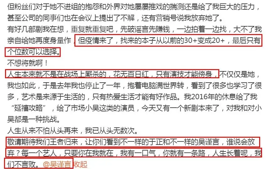 因此,在老板于正看来,吴谨言的当务之急是提升演技,于是,他们推掉多个找上门来的剧本,放空自己,认真琢磨演戏这件事。