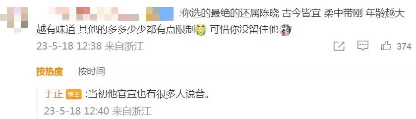 有的还在回味当年于正挖掘的陈晓,那叫一个惊艳,于正则回复“当初他官宣也有很多人说普”,呃……陈晓一点也不普,非常帅气的啊。