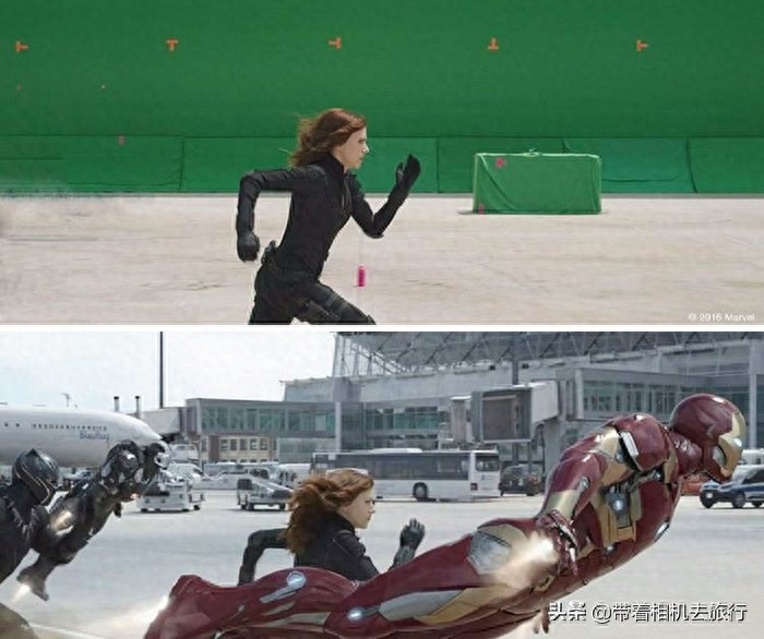 但实际上,即便是普通场景的镜头,很多高难度的动作以及场景,实际也有很多是靠绿幕完成的。