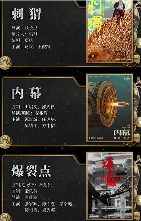 包括刘德华和梁朝伟合作的《金手指》,谢霆锋和张学友合作的《海关战线》,葛优和王俊凯主演的《刺猬》,郭富城和任达华等主演的《内幕》,张家辉和陈伟霆主演的《爆裂点》等等。