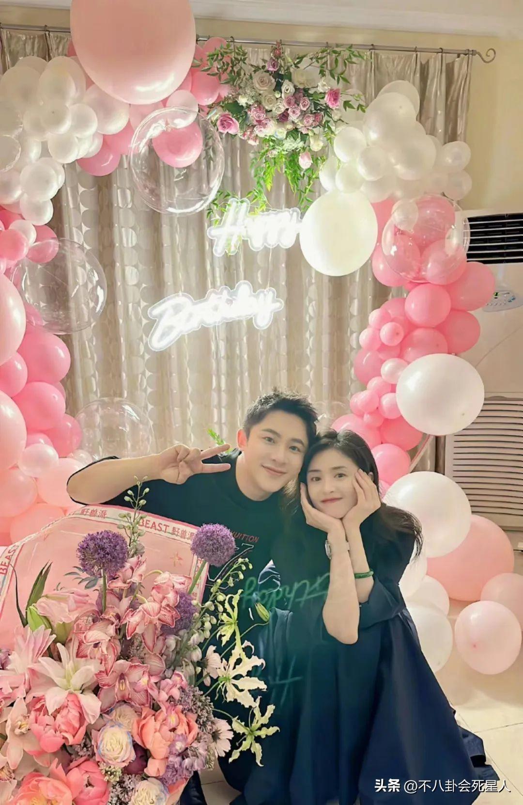 从图片来看,庆生现场布置得简单又浪漫,粉白色的气球相间,加上鲜花的点缀,蒋欣对着镜头比心,十分可爱。