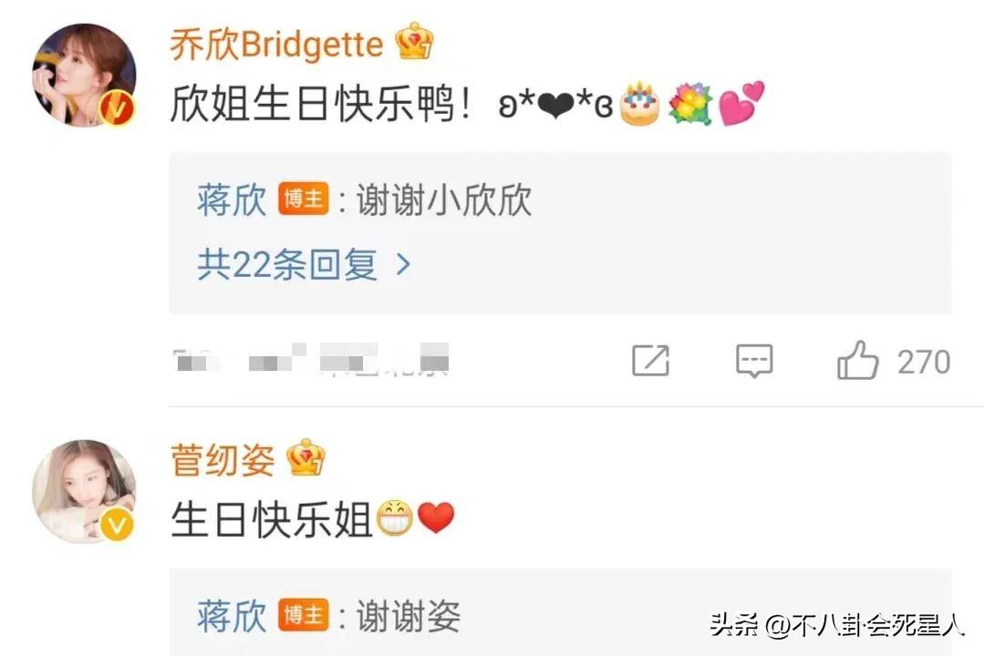 蒋欣发布庆生图片没过多久,著名造型师马锐率先发文祝福。接着,乔欣和菅纫姿都来留言,祝福蒋欣生日快乐,她也很快做出回复。