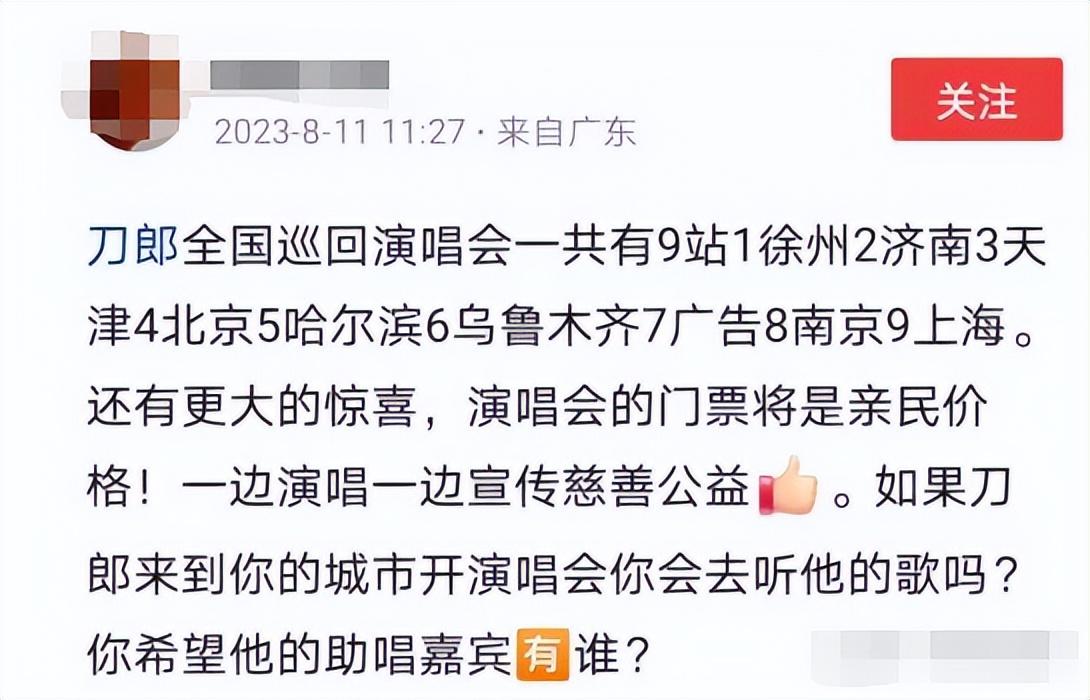 据传,刀郎即将开启全国巡回演唱会,一共有9个地方,包括徐州、济南、天津、北京、哈尔滨、乌鲁木齐、广州、南京、上海,而且还邀请了很多重量级嘉宾。