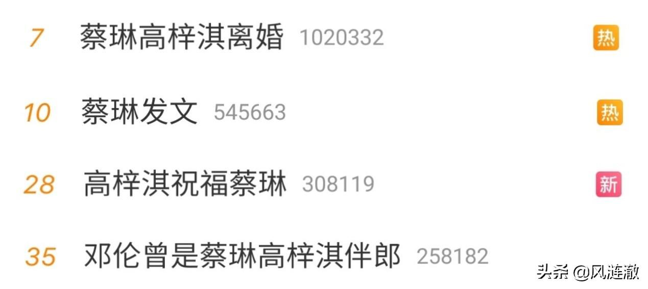 自蔡琳和高梓淇离婚的消息一经传出,引起了广大网友们的热议,很快“蔡琳高梓淇离婚”、“蔡琳发文”、“高梓淇祝福蔡琳”、“邓伦曾是蔡琳高梓淇伴郎”4个话题就登上热搜榜。