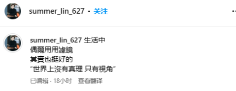 她在文案当中表示“世界上没有真理,只有视角”,不知道是不是就是在回应关于怀孕的事,她的意思可能是说当时只是因为视角的问题吗?但是她又没有直接否认,到底有没有怀孕,还是一个未知数。
