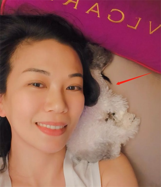 她穿着一件简单的无袖白色上衣,躺在沙发上,头还轻轻的垫在可爱的小狗狗身上,脸上看不出带妆的痕迹,没有妆容修饰的脸,非常的漂亮清秀,唇红齿白,相当亮眼。