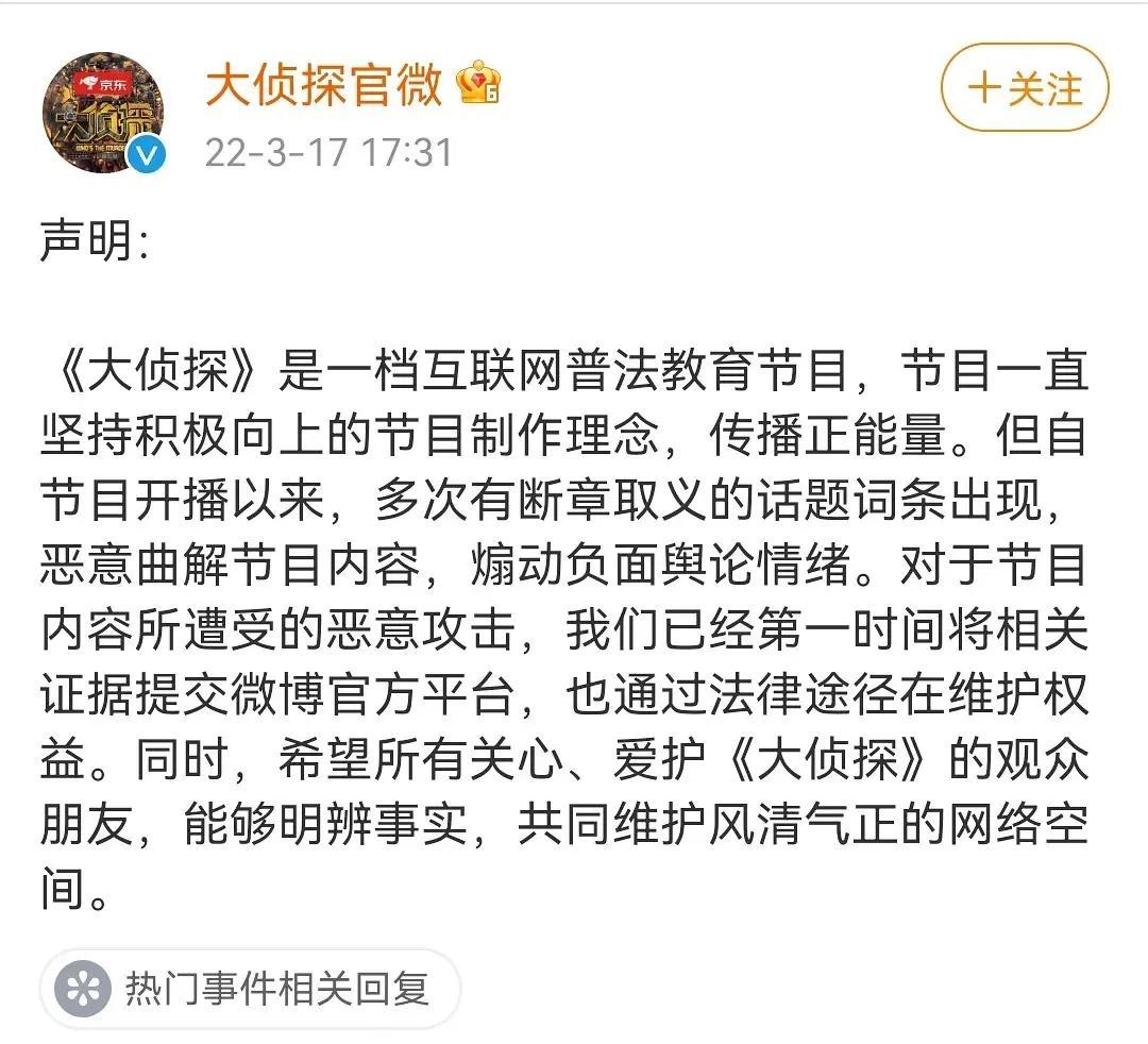 大侦探在几次黑话题之后发表了声明,然而热度较平,给明星嘉宾带来的负面影响不能完全消除。