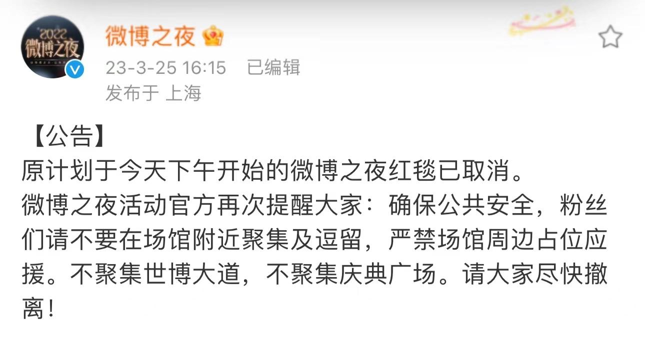 但让人没有想到的是,主办方临时发出通知,表示原计划下午开始的红毯已经取消,并希望粉丝们不要在场馆附近聚集及停留,并严禁场馆周边占位应援。消息一出,评论区可谓是骂声一片。