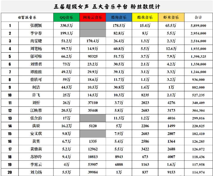 有人统计过五届快乐女声的音乐数据排行榜,李宇春位居张靓颖之下,其次就是尚雯婕和周笔畅,连大众一致认可演唱实力的谭维维才排第7位。