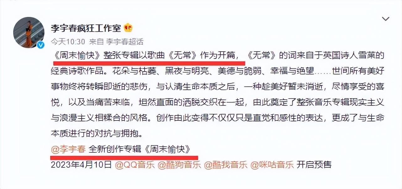 喜大普奔,李宇春将发新专辑,专辑将在4天后4月10日发布,作为李宇春的粉丝们应该是2023年最开心的事情,而有些贪心的粉丝们开始憧憬,专辑都发布了,那么离演唱会还远吗?