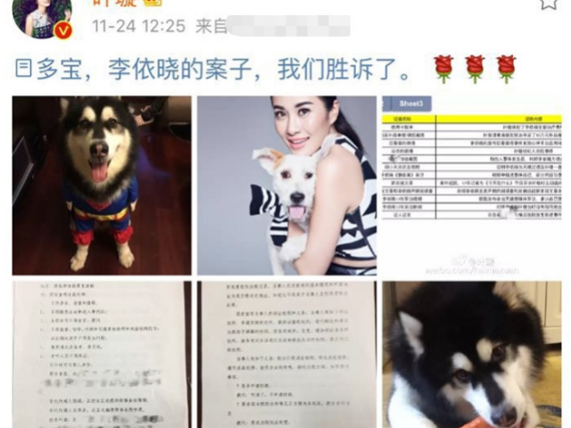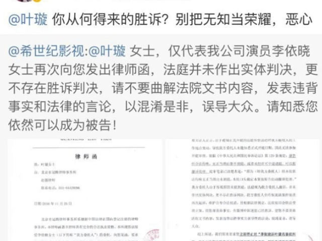 2016年11月,叶璇发了一条微博,主要内容是自己和李依晓的案子里自己胜诉了。