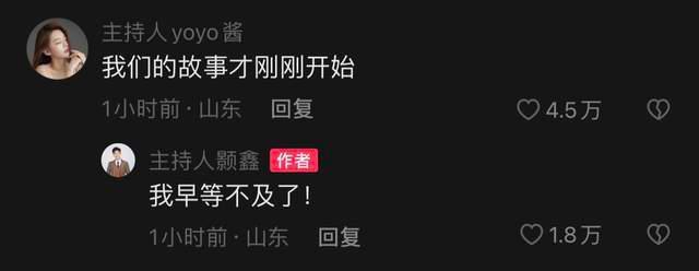 yoyo 与颢鑫官宣恋情后,大方在评论区撒糖。yoyo 说:" 我们的故事才刚刚开始。" 但男方却表示他早就等不及了,由此可见,颢鑫早就爱上了对方。