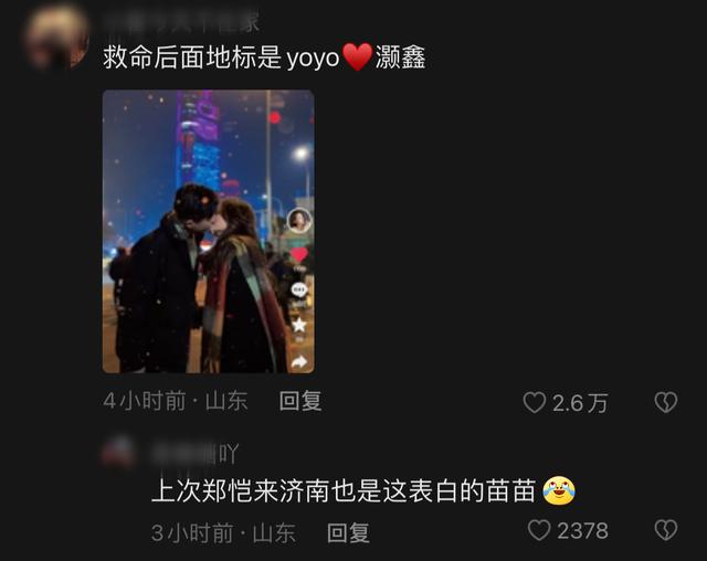值得注意的是,两人身后的高楼上,除了 " 我爱济南 " 这几个字之外,还亮起了 yoyo 与颢鑫的名字,中间有一个浪漫的爱心,大厦表白灯十分气派。