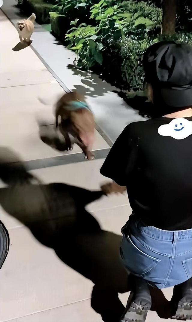 视频中,陈乔恩穿着黑色 T 恤搭配牛仔短裙,她看见爱狗时非常激动,整个人都跪在地上抱它们,画面相当温馨。