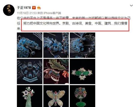 不说别的,单看于正大力宣传中国传统文化这方面,就要为他点赞。而且每次有什么大事情,他都几乎第一时间发声,挺正能量的!
