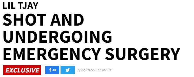 6 月 22 日,据外媒报道,说唱歌手 Lil TJay 昨晚在新泽西州遭到枪击,身中数弹,目前正在紧急手术抢救。