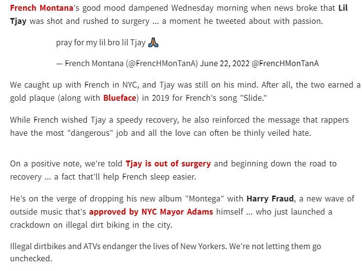 最新报道显示,Lil TJay 已做完手术,进入恢复阶段。他的朋友 French Montana 也在社交媒体发文希望 Lil TJay 尽快痊愈,并强调 Rapper 是最危险的职业。