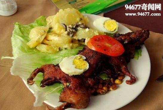 在厄瓜多尔,天竺鼠被视为一种特别的佳肴。甚至,一对正在交配的天竺鼠还能成为新婚礼物。制作这道菜,天竺鼠会被摆成四肢展开呈大字形。是世界上最恶心的食物之一。