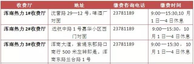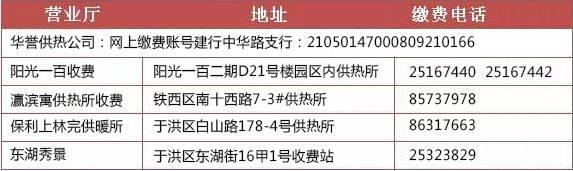 如果您家的供热公司还不支持互联网缴费也别着急,采暖费现在也能交!最近没啥事,趁人少的时候就去交了,省得过一个月排大队。停供和恢复供暖也能现在办,最后附上沈阳部分供热公司、缴费营业厅的地址和电话,有什么问题可以直接打电话咨询哦!