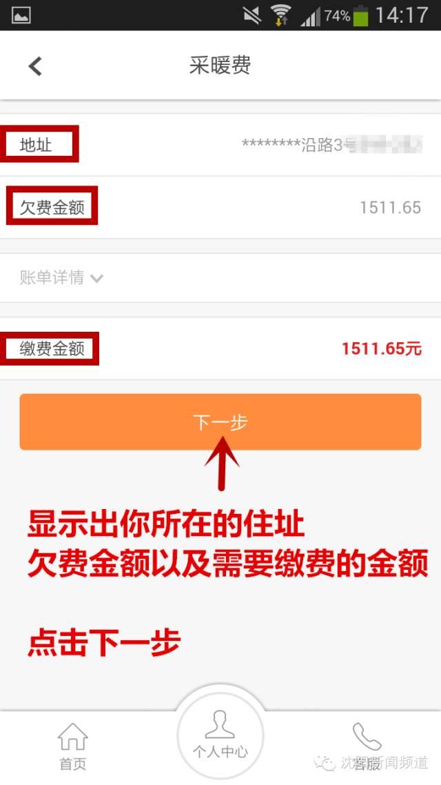 第三步:你会看到这样一个界面,显示你家住址和欠费金额,核对信息点击下一步。