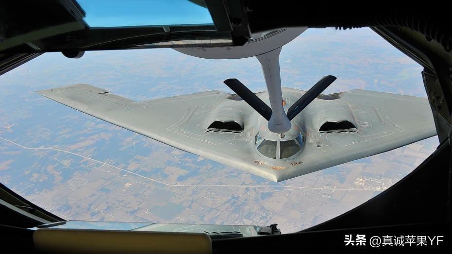 一架 KC-135 Stratotanker 飞机在堪萨斯州上空为第 509 轰炸机联队的 B-2 Spirit 飞机加油