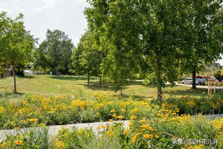 建筑和景观融合形成一个富有表现力的整体。公园的景观成为工作环境的一部分,而工作环境向公园开放。无定形布局是建筑物外部的特征,并创造了许多独立的空间和氛围。沿场地边界,从内部到外部的过渡由足够的平面形状构成。建筑物和景观与设计语言相遇的地方是由建筑和空间对象(例如水体,种植的林分和露台)从内部投射到景观中的。自由和起伏的形状定义了从概念级别到细节的建筑物和景观共享的设计。