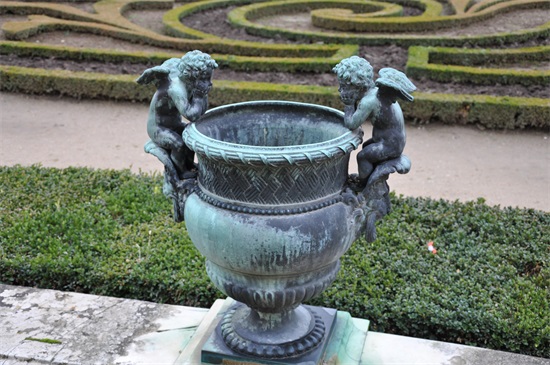 正宫前面是一座风格独特的法兰西式大花园。园内树木花草的栽植别具匠心,景色优美恬静,令人心旷神怡。站在正宫前极目远眺,玉带似的人工河上波光粼粼,帆影点点,两侧大树参天,郁郁葱葱,绿阴中女神雕塑亭亭而立。近处是两池碧波,沿池的铜雕塑丰姿多态,美不胜收。