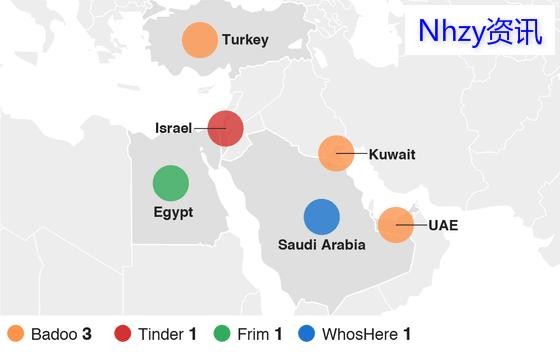 在伊斯兰教为主的中东,男女戒律严格,土耳其、科威特、UAE(阿联酋),Badoo还是颇具人气的。不过,在埃及,Firm才是榜首。沙特阿拉伯则流行WhosHere。Tinder在以色列则受到热捧。