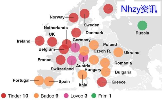 东欧的用户喜欢Tinder,西欧的用户则更偏向Badoo。而“两牙”,葡萄牙和西班牙的用户的下载排行榜榜首是Badoo。在德国、瑞士、奥地利,Lovoo则成功压制Tinder和Badoo。Lovoo是一款来自德国的约会软件。