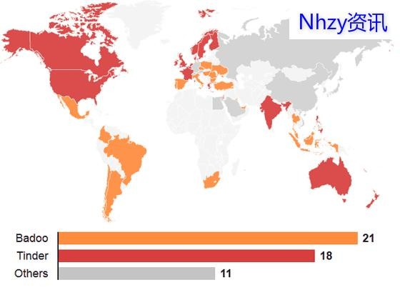 整合App Store和Google Play的下载次数,Badoo和Tinder分别占据12个国家和11个国家的排行榜榜首。也就是说,目前,约会软件中最热销的非Badoo和Tinder莫属了。