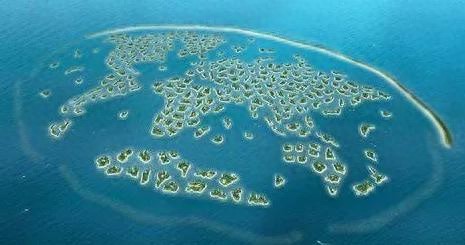 世界岛,位于阿联酋迪拜沿岸,由300个岛屿模仿地球7大洲构成一个微缩版的地球,每个岛屿的面积从23000平方米到83600平方米不等。
